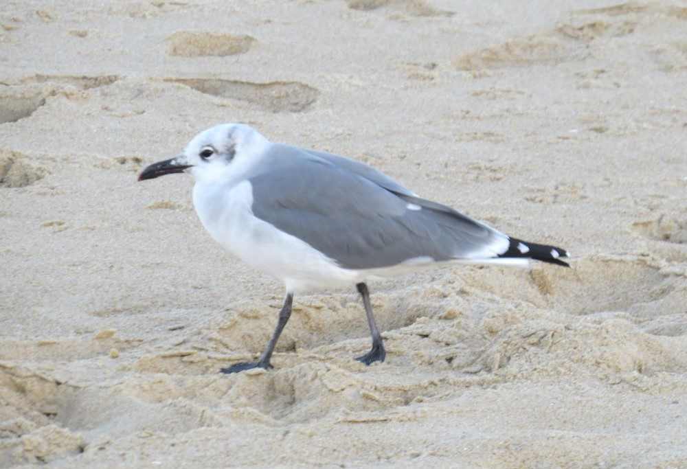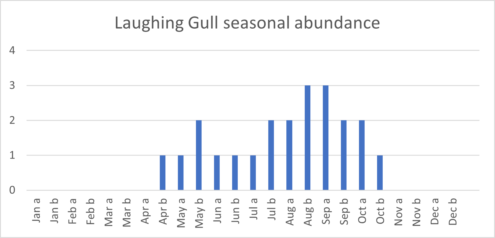 Breeding Laughing Gulls are distinctive among the summer gulls of eastern North America in that they have completely black heads. They are predominately a southern coastal species but do nest along the coast as far north as Maine, typically in large, isolated colonies on offshore islands. None breed in New Hampshire, where Laughing Gulls are typically found in late summer as post-breeding and early fall visitors. Many of the birds seen at this time are young birds dispersing from nesting sites, and these lack the characteristic black hood of adult Laughing Gulls. Adults will still show this plumage in July and August, but any that linger into late September or October are likely to have molted into a non-breeding plumage that’s similar to the younger birds. Laughing Gulls are always outnumbered by our more common species but watch for them along the immediate coast along with Ring-billed and American Herring Gulls. They are almost never seen inland, even as close as Great Bay.