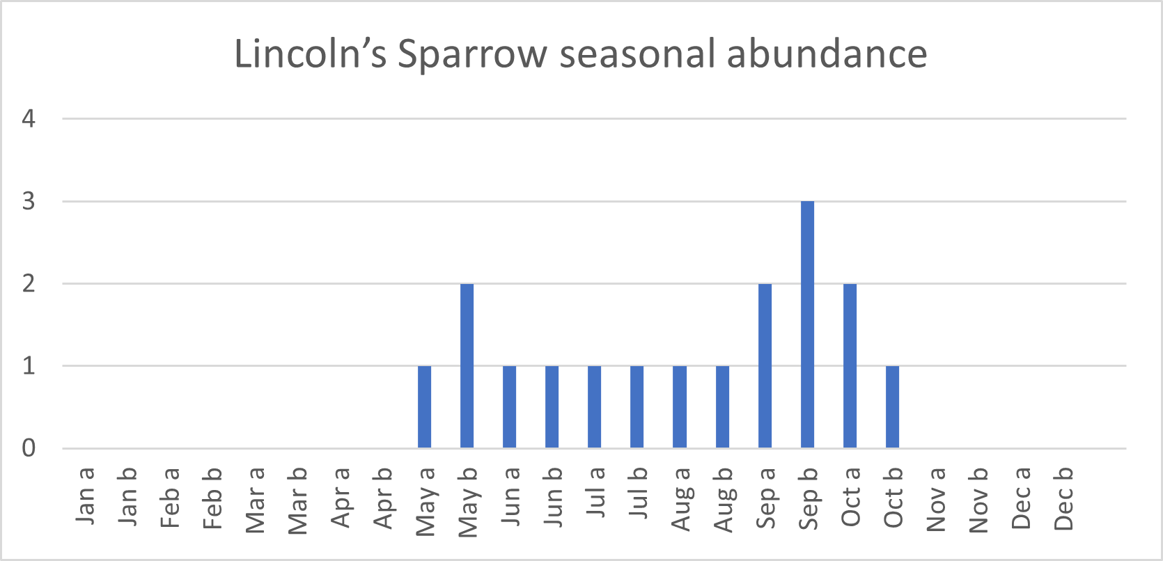 Even in the North Country where it breeds, the Lincoln’s Sparrow is encountered irregularly. It is most consistently found north of Errol, with a smaller concentration in the Pondicherry area and scattered records in parts of the White Mountains. Look for it in bogs, wet thickets, and regenerating timber cuts. Often the first sign of this secretive species is its distinctive song, a bubbling series of chirps and trills similar to that of a House Wren. House Wrens don’t occur in these habitats, so if you hear one try to find the Lincoln’s Sparrow!