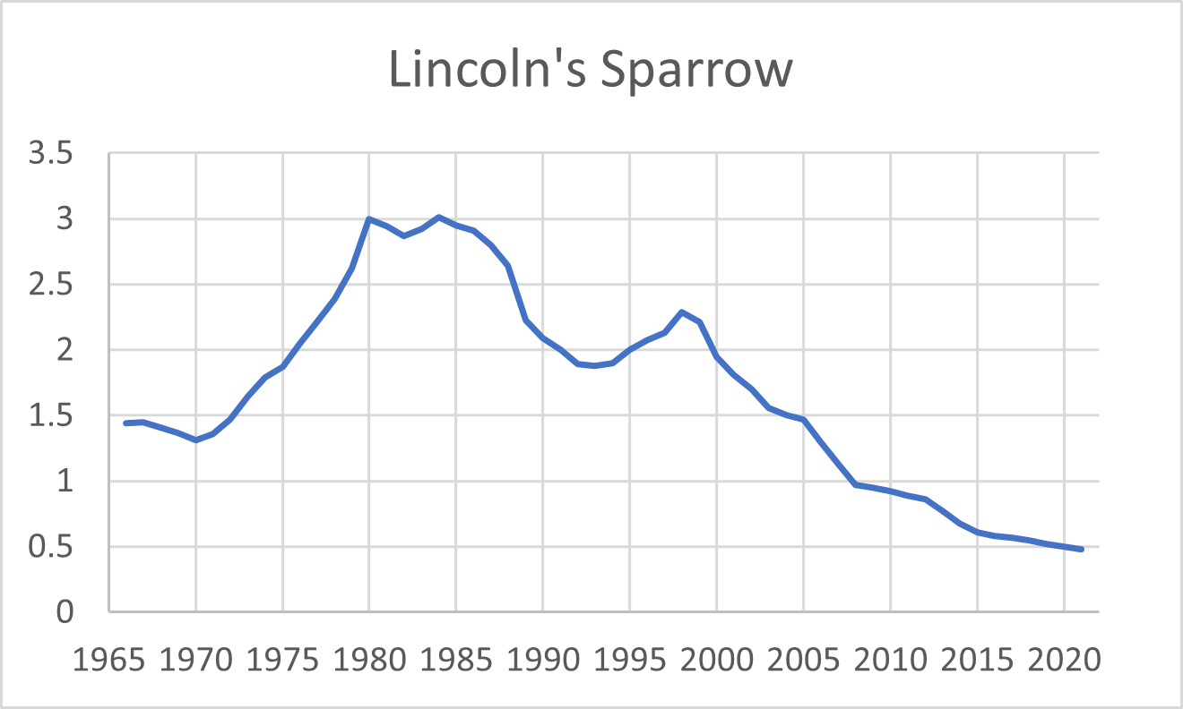 Historical records suggest that Lincoln’s Sparrow was scarce in the early 1900s, and not reliable in summer until the 1950s. It increased for another 20-30 years, as shown in the trend graph, but has been declining regionally since 1980. Since the species is not well-studied, we know little about what threats it might face, but its historic ups and downs might be related to shifting availability of early-successional habitat. Because it is one of our more northerly breeding species it may also be more vulnerable to climate change.