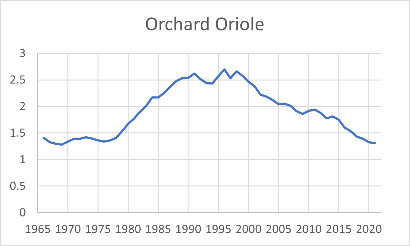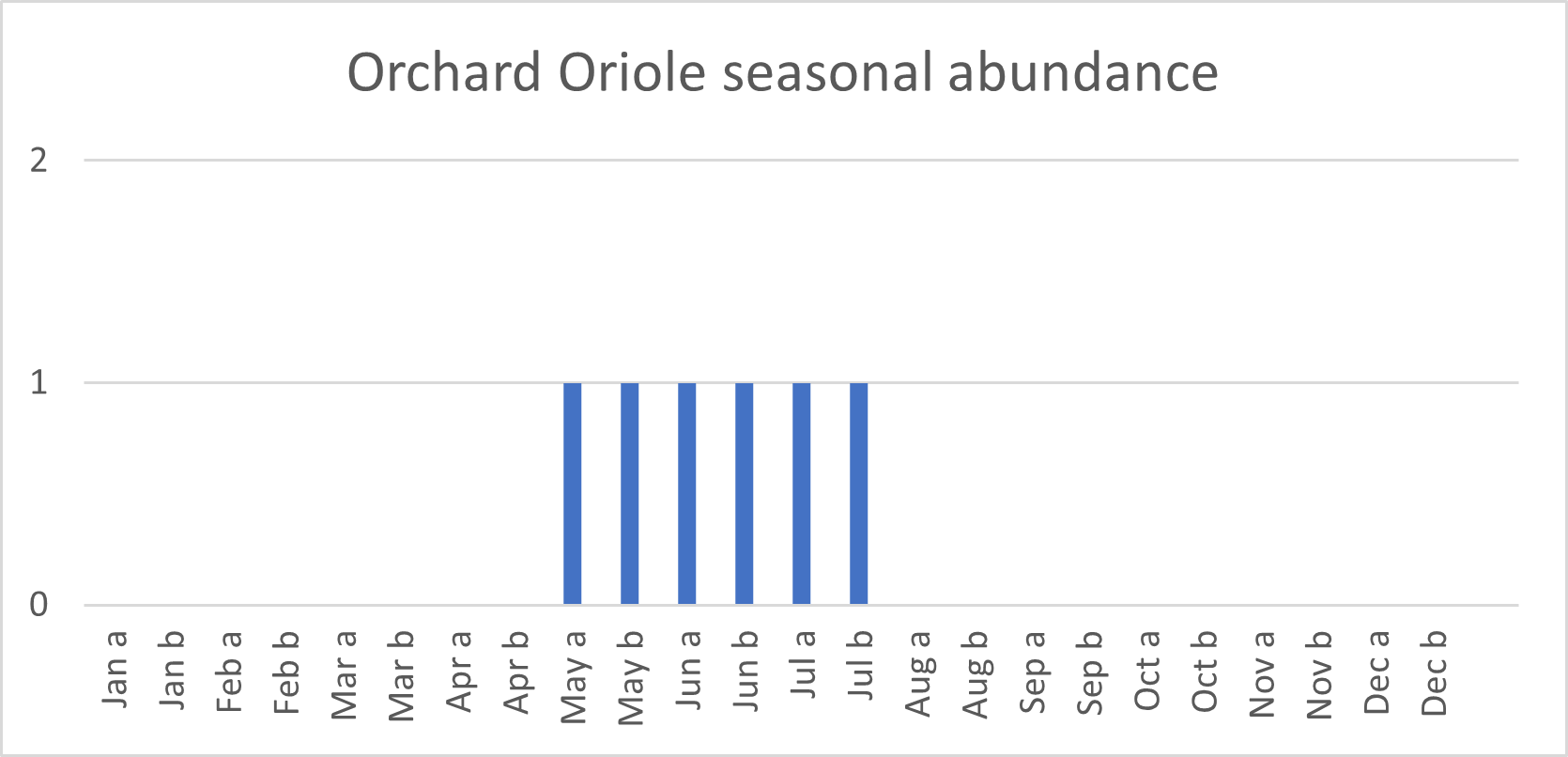 The Orchard Oriole is a southern species whose range has slowly expanded into the Granite State. As recently as the 1980s it was considered rare and of irregular occurrence, and during the Breeding bird Atlas Orchard Orioles were only found in six places in extreme southeastern New Hampshire. Since that time it has become more reliable in the southeast, although its center of abundance remains a swath from Rochester to Nashua. It has also expanded up the Merrimack River as far as Concord and the Connecticut as far as Haverhill, although it remains patchily distributed and irregular in the northern portions of its range along those rivers.