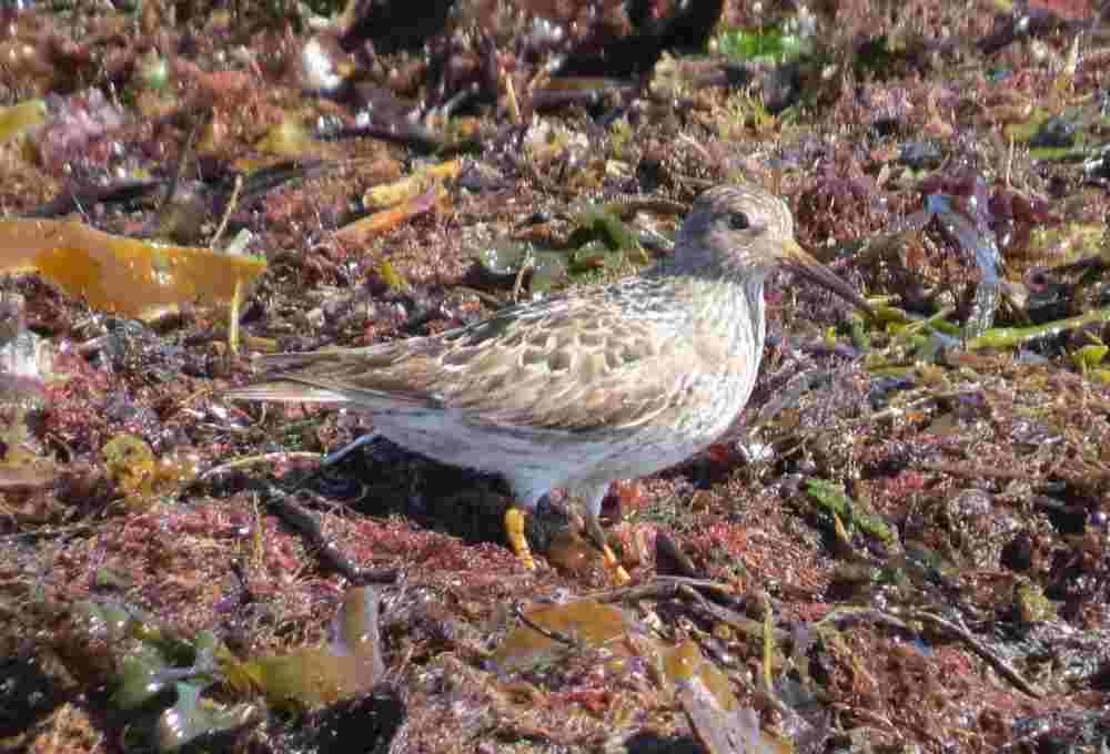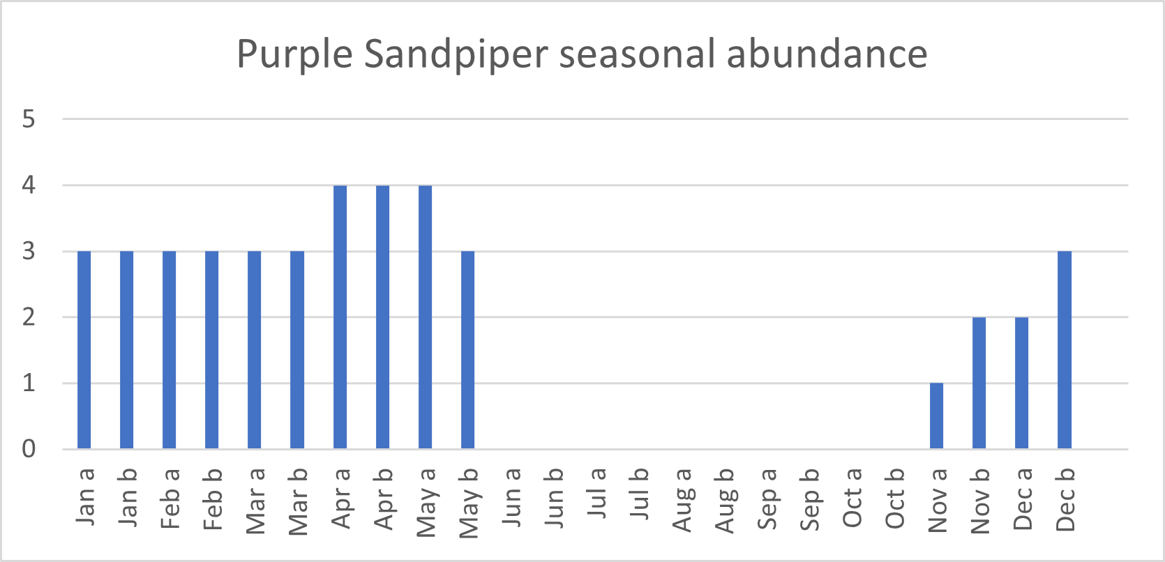 While most shorebirds that use the New Hampshire coast occur during spring and fall migration, a handful also occur during the winter (e.g., November through April). Of these, the Purple Sandpiper has the northernmost range. Unlike most other shorebirds, this denizen of rocky shorelines migrates no further south than the Carolinas, and small numbers in southern Greenland winter farther north than any other sandpiper in the northwest Atlantic. When visiting us during their non-breeding season they are typically seen foraging on seaweed covered rocks just above the waterline, often dodging breaking waves. They roost on jetties and other rocky areas above the high tide line.