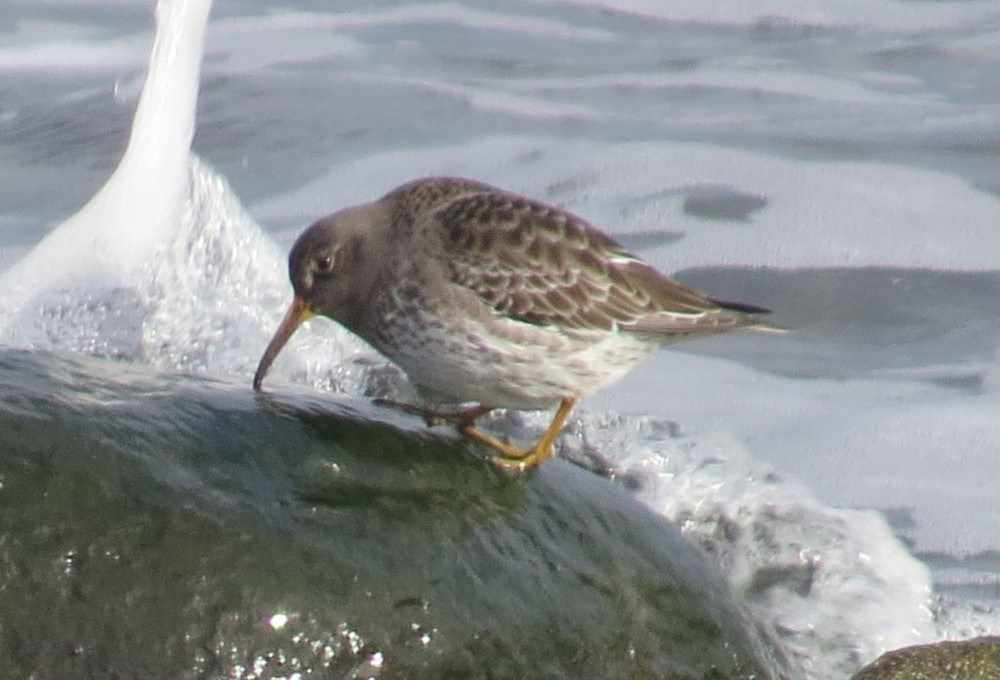 Purple Sandpipers are one of those birds with a less-than-appropriate English name. They can in fact show a purplish tinge to their otherwise grayish winter plumage, but this is rare and probably best seen when a bird is in the hand (as specimens no doubt were when the species was named). A far better field mark in the winter is the bright yellow-orange legs, which stand out more strongly than the feathers against dark rocks. When Purple Sandpipers flock together with Dunlin their leg color is one of the easiest ways to tell the two species apart in a quick scan. In spring they molt into a streaky brown plumage that is best seen in May as birds prepare to migrate north.