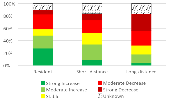 The farther a species migrates, the greater the chance that its population is declining. More species are increasing or stable than declining among residents and short-distance migrants. These numbers flip for long-distance migrants however, over 50% of which are in decline. No matter how far they travel, migratory birds face additional challenges.